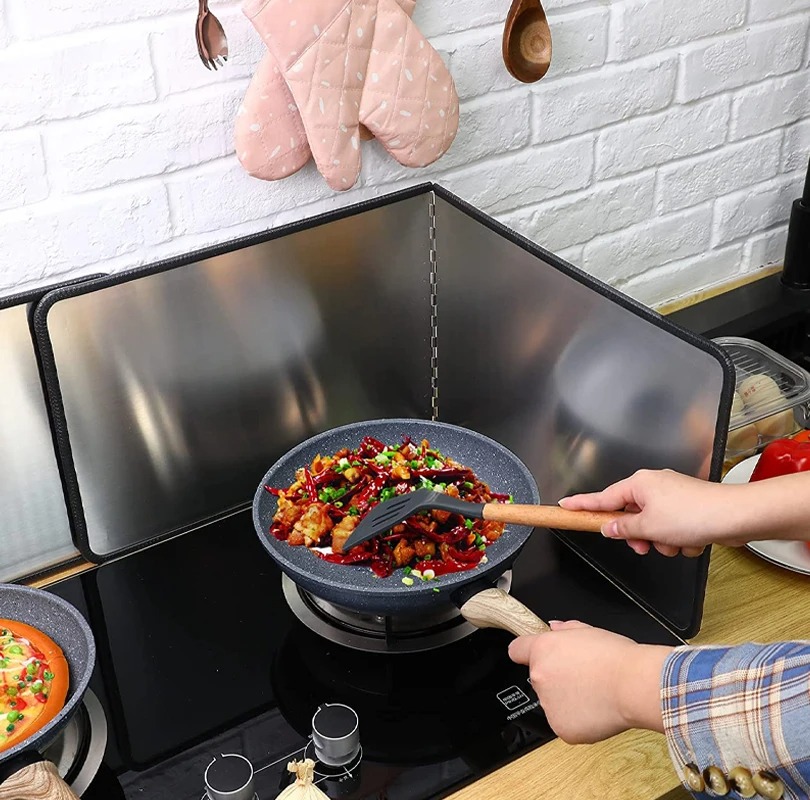 El protector contra salpicaduras de cocina bloquea eficazmente las salpicaduras de aceite en la cocina, y el efecto de aislamiento térmico es bueno, evitando que la pared de la estufa se cubra con aceite, y el plástico circundante, especias, latas, etc. se calientan para derretirse, deformarse, Y también se puede utilizar como tabla a prueba de salpicaduras para lavar alimentos.