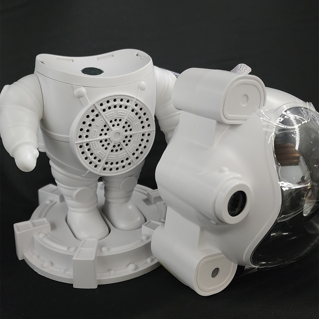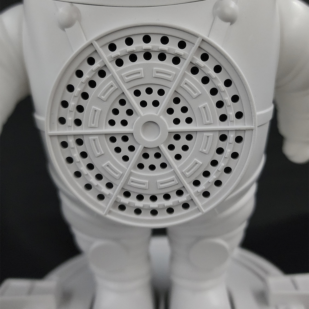 Este Astronauta, ideal para cualquier regalo, es de color blanco. Tiene en la parte de atrás 4 botones: 1 para controlar la música bluetooth o los sonidos; 1 para cambiar el movimiento de las nebulosas, estrellas y la Luna; los dos últimos para ajustar el volumen de la musica (+/-) y cambio de canción o sonido. Adicional, cuenta con un control remoto con funciones adicionales.