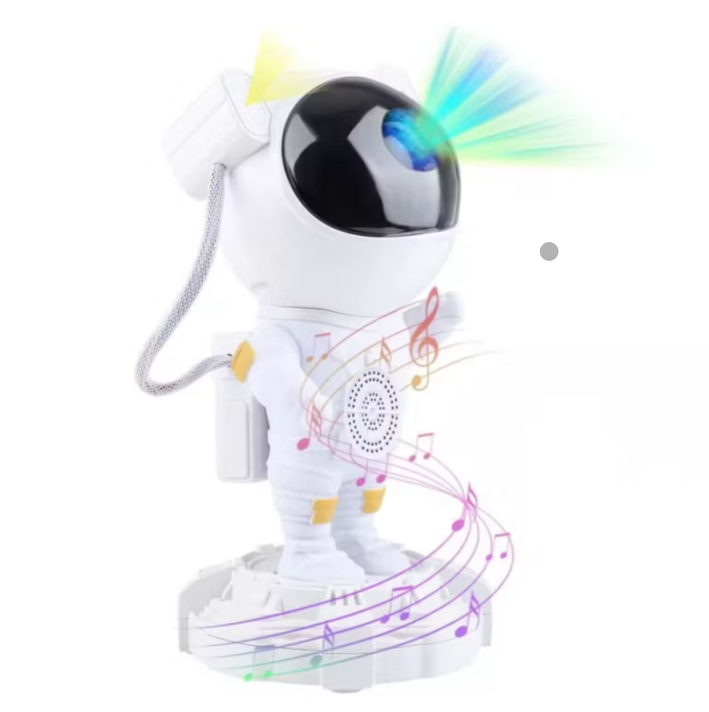 El Astronauta te ayudará a que tus noches en la habitación sean increíbles, con su cabeza giratoria (360°) emite diferentes efectos de nebulosas coloridas, movimientos de cielo estrellado y la Luna en el lugar deseado. Adicional, cuenta con un reproductor de música por medio de Bluetooth y trae incorporados 8 sonidos relajantes (lluvia, océano, pajaritos, música para dormir, canción de cuna, naturaleza, fogata, ruido blanco).