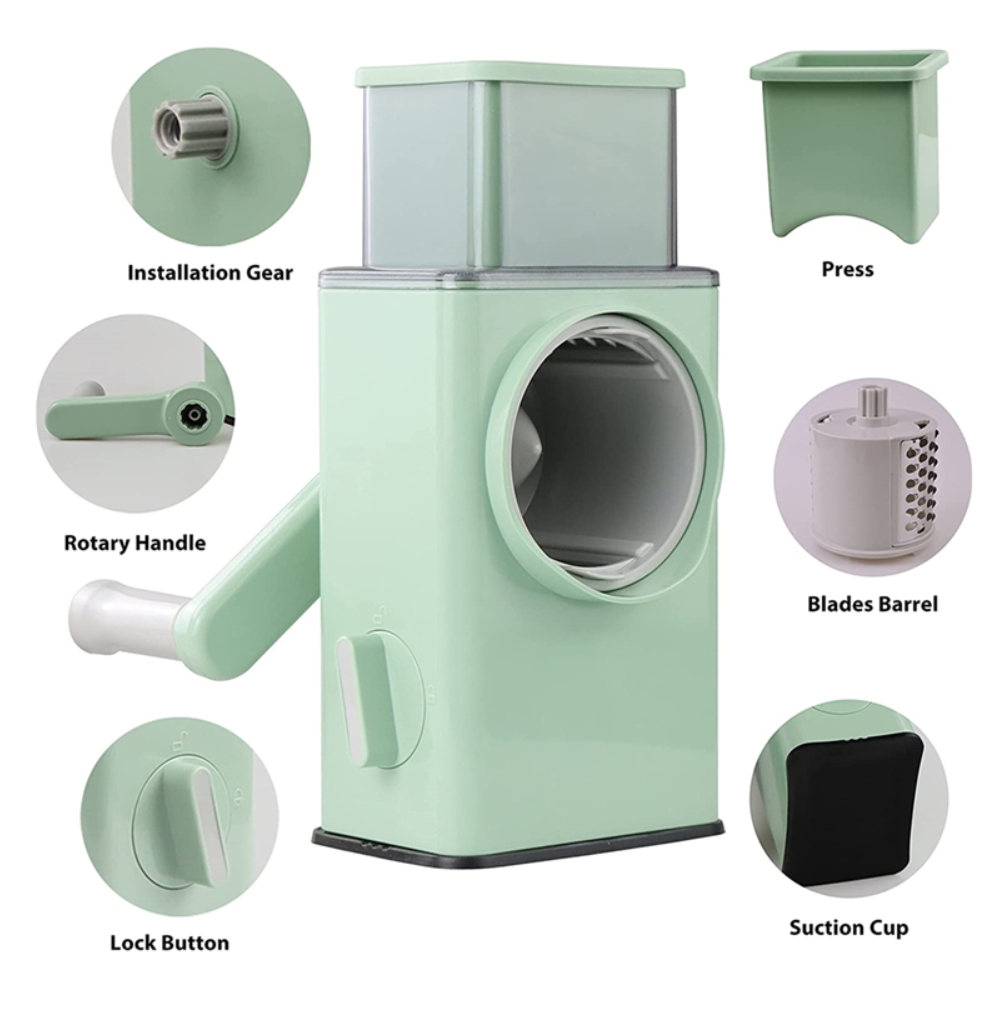 Trituradora multicorte de cocina: puede ayudarle fácilmente con la preparación de alimentos (rebanar, picar, moler), perfecta para rallar queso, zanahorias ralladas, papas fritas. | También funciona con pepinos, calabacines, ajos e incluso nueces. | El fondo está completamente cubierto con la ventosa, que tiene un área más grande y una fuerza de adsorción más fuerte.