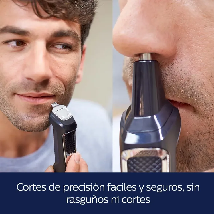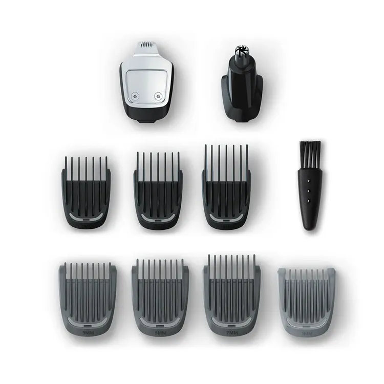Recortador de precisión<br>Recortador giratorio para nariz<br>Recortador de acero templado<br>3 peines-guía para recorte de barba<br>3 peines para recorte de cabello<br>Peine-guía para recorte de barbas incipientes