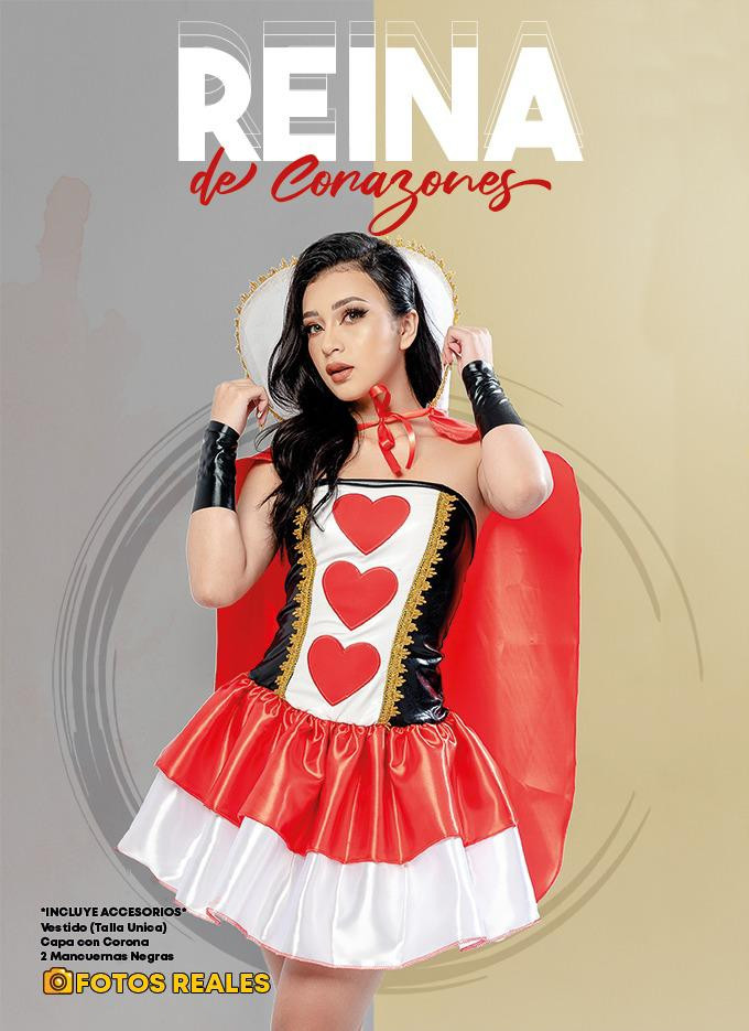 Disfraz de reina de corazones, Talla única (para chicas de XS hasta M) el precio incluye el vestido, capa con corona y mancuernas.