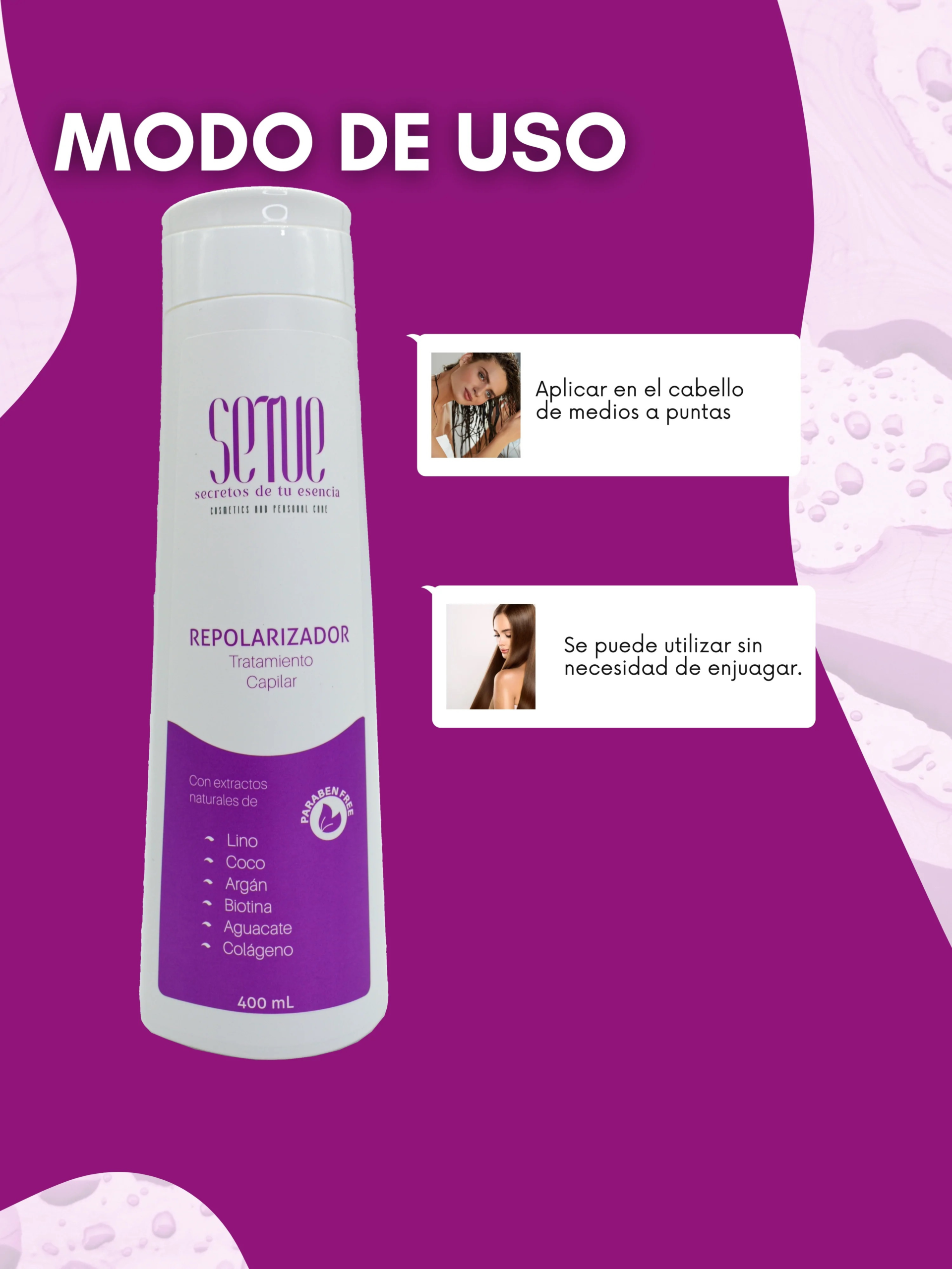 Nuestro poderoso repolarizador es un tratamiento capilar nutritivo que potencia el crecimiento gracias a su fórmula compuesta por 18 óleos y extractos naturales, vitaminas y proteínas para lucir un cabello brillante, sedoso, suave y fuerte.