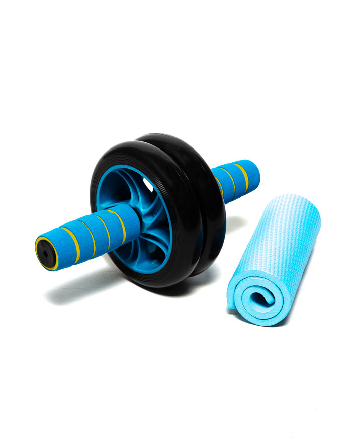 Rodillo abdominal azul con el cual puedes hacer distintos ejercicios @Incluye: @1 rodillo @1 Mini colchoneta