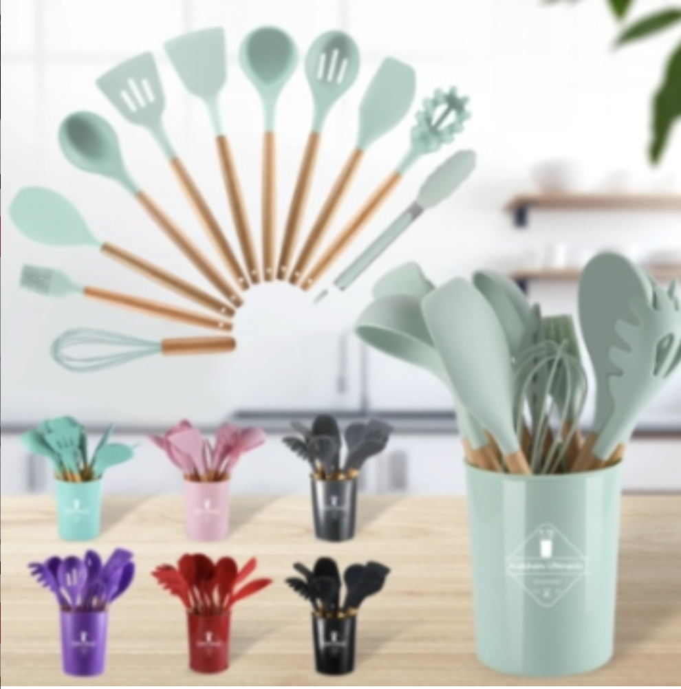 Set de 12 piezas: 10 piezas antiadherentes siliconadas, 1 pinza metálica y 1 base para almacenar todas las piezas. •Mango en madera. •Resistente al calor.