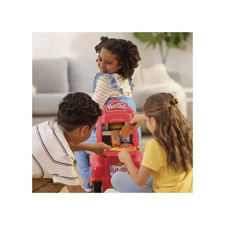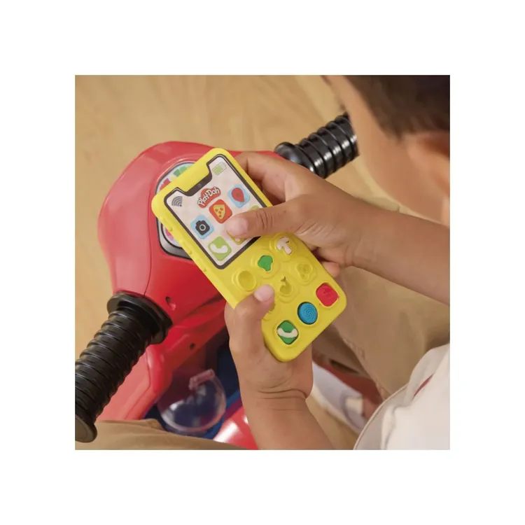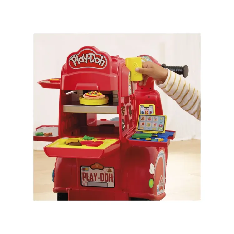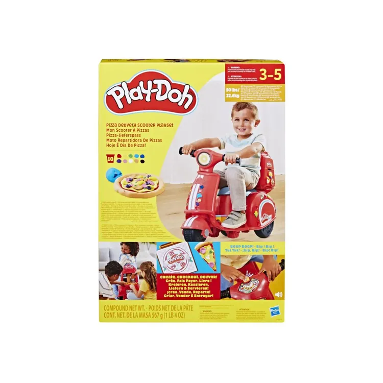 Incluye moto sin armar, 2 cajas de pizza, teléfono celular de juguete, carta de crédito de juguete, paleta de pizza, cortador de pizza, vaso con tapa, molde de helado, cono de helado, herramienta de prensa, espátula, 2 platos, tenedor, cuchillo, rodillo y 10 botes de plastilina Play-Doh (contenido neto: 567 gramos).