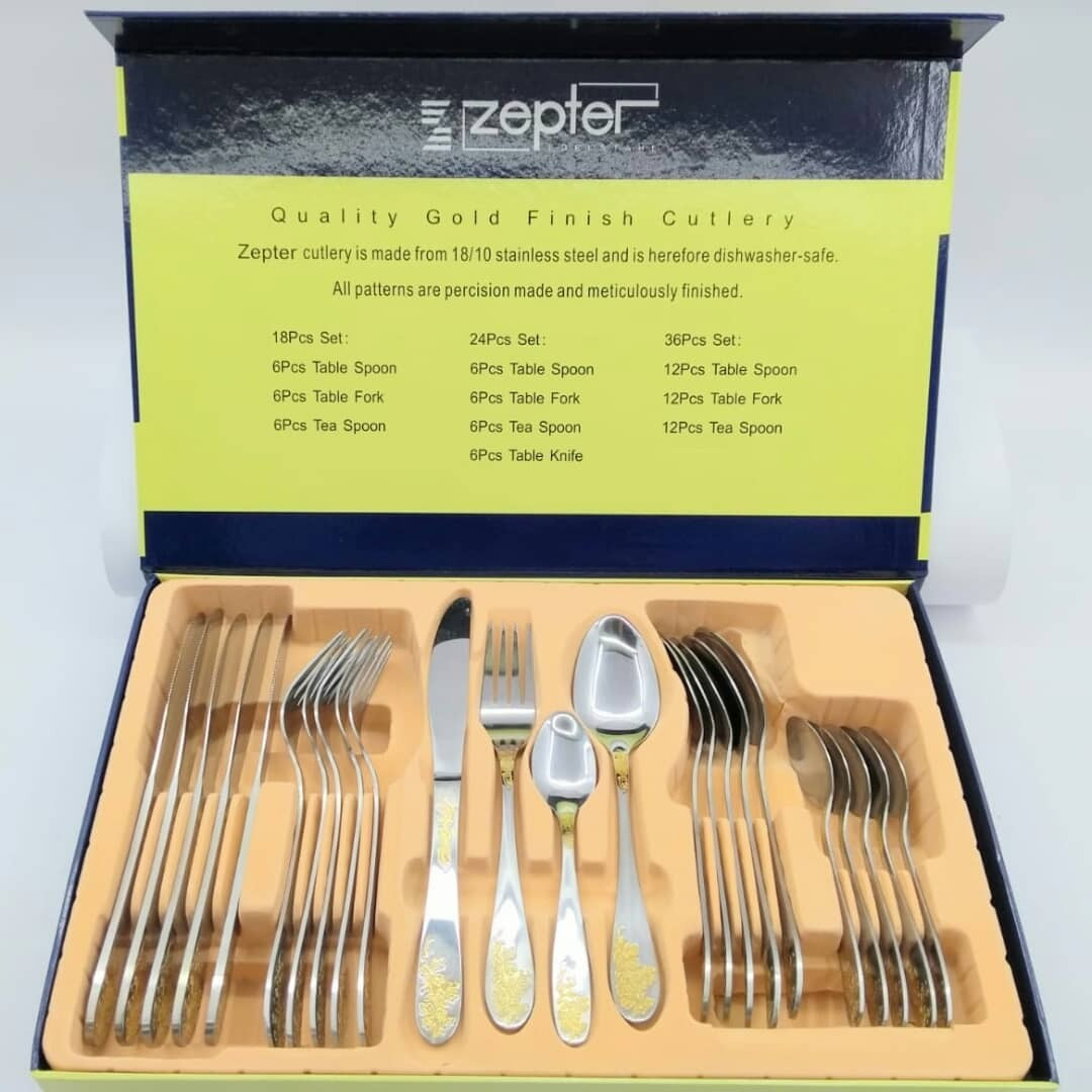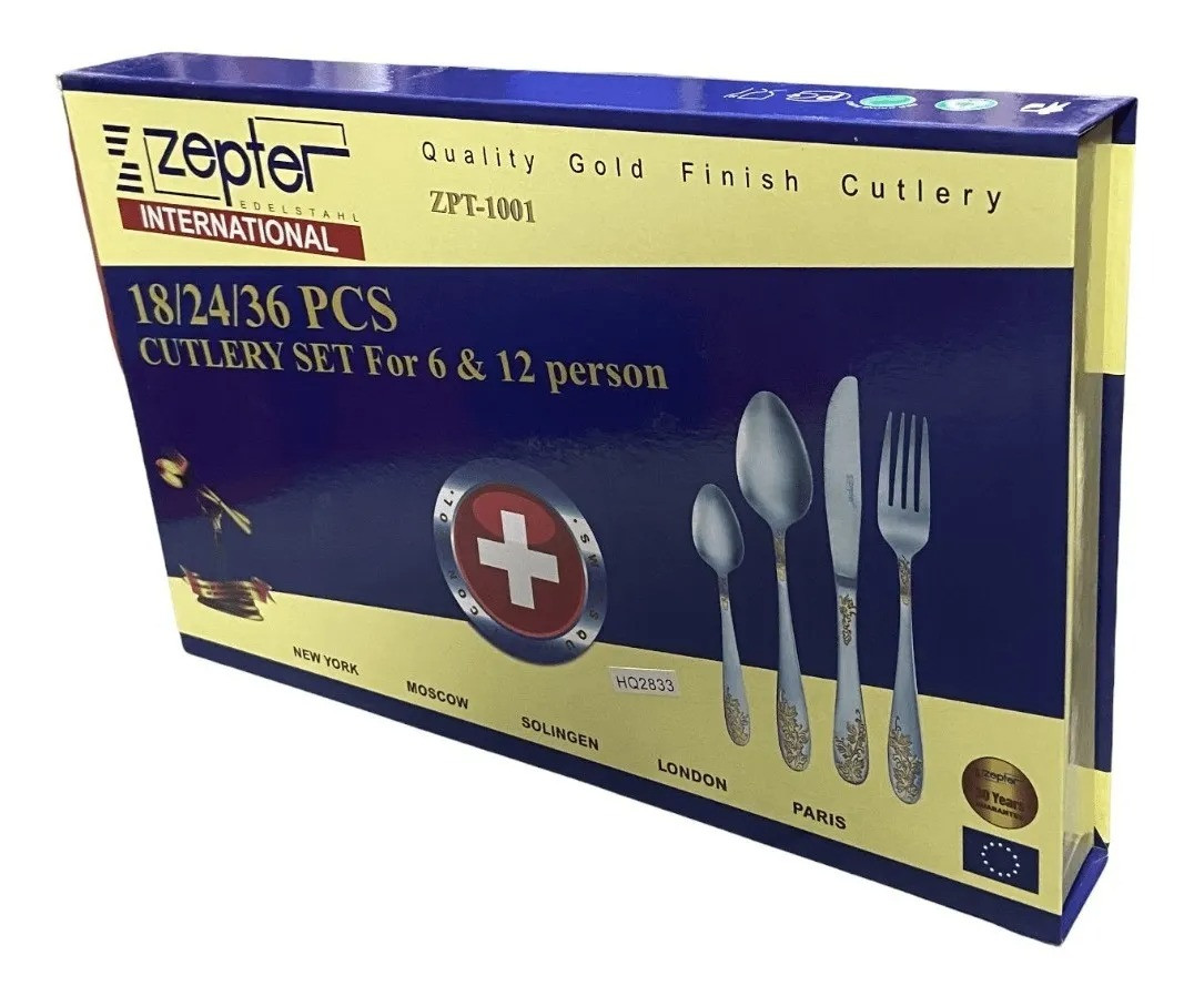Set de cubiertos en acero inoxidable de 36 piezas Zepter Esta colección es un verdadero arte por sí mismo, hecho a mano y con 37 etapas. Es el juego más vendido y el más popular en la selección de artículos más importantes e innovadores. Está diseñado para dar una vida útil a todo lo que tenga que ver con la cocina haciendo de la comida más sabrosa, deliciosa y elegante, utilizando los mejores materiales posibles para proteger tu salud con el material correcto.