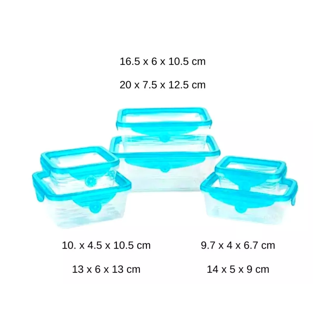 •FRESCO – Las cajas de frescura tienen un cierre de 4 broches y un sello de silicona de alta calidad. Esto mantiene la comida fresca durante mucho tiempo. •PRÁCTICA – Las latas de comida fresca pueden soportar temperaturas que van de -20°C a +330°C. Por lo tanto, puede congelar la comida y recalentarla inmediatamente después o cocinarla en el horno o el microondas. •LAVAJILLAS – Para una fácil limpieza, los Klick-its son totalmente lavables en el lavavajillas. •Incluye 6 contenedores 4 rectangulares y 2 cuadrados: 11 x 8 x 4.5 cm – 170ml 15.5 x 10.5 x 5.5 cm – 450ml 18 x 6.8 x 12.2 cm – 850ml 21.3 x 14.5 x 7.8 cm – 1450ml 11.8 x 11.8 x 5 cm – 350ml 14.5 x 14.5 x 6 cm – 700ml