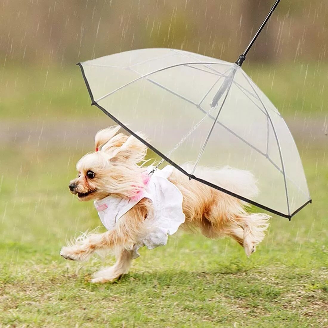 Sombrilla para proteger a perros y gatitos en los días lluviosos. Funciona igual que una sombrilla normal pero al revés, ya que el manubrio o barra metálica es la parte que la persona sostiene hacia abajo para tapar al peludo y este viene agarrado a la sombrilla por medio de una cadena metálica que se sujeta al collar o arnes del peludo; es en material plástico transparente para que se pueda ir viendo al peludo desde arriba. Tamaño Standard, muy cómoda, amplia y fácil de usar. Se cierra y queda igual a una sombrilla común. Ideal para perros pequeños y medianos.