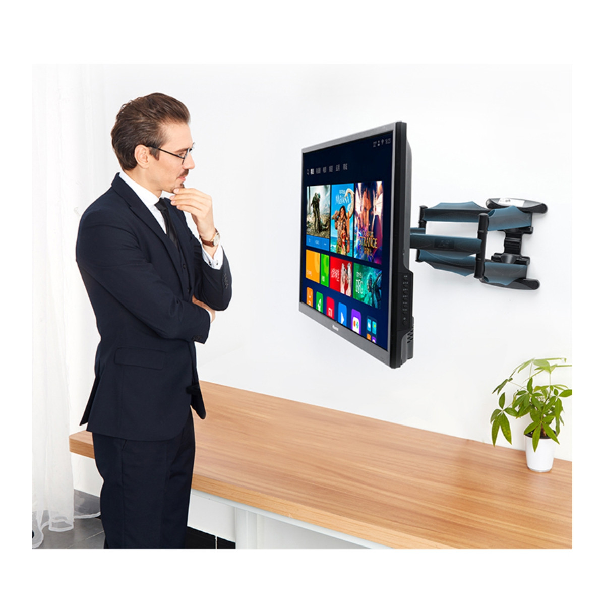 Este diseño de bajo perfil hace que su pantalla plana quede más pegada a la pared, a sólo 54mm. El organizador de cables evita el desorden de los mismos y el sistema de brazo extensible facilita la conexión de cables que van al TV. El brazo puede extenderse hasta 496mm para movimiento lado a lado más amplio.