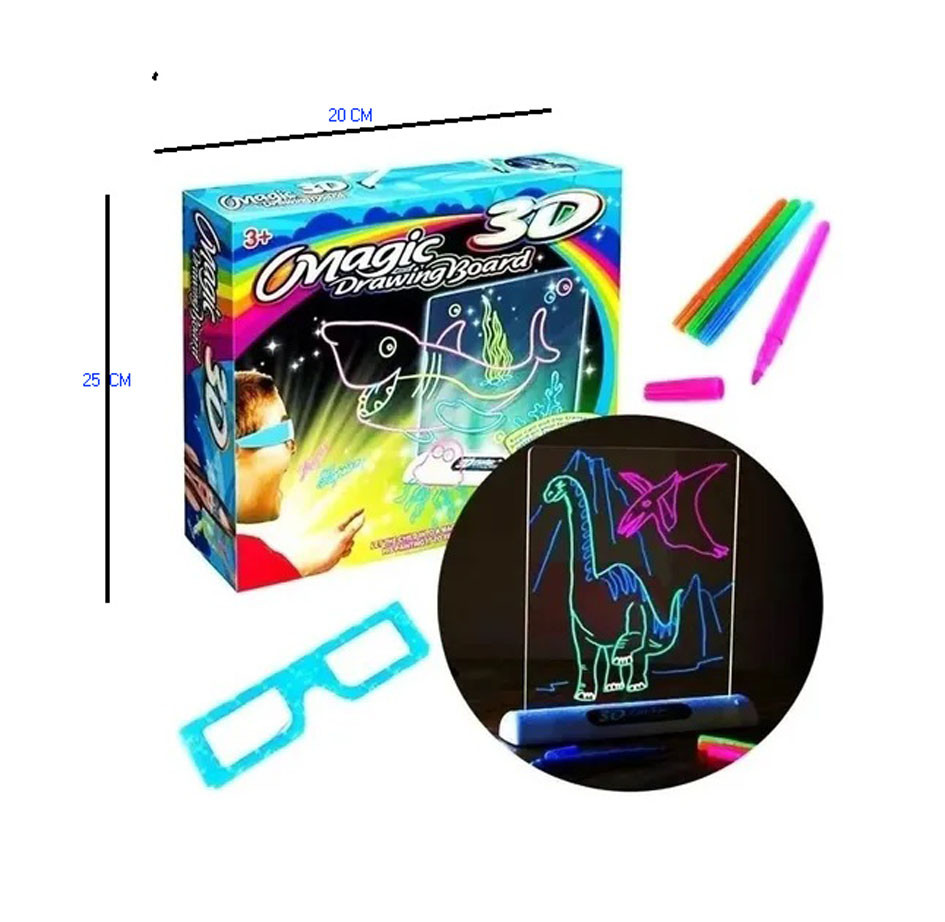 tablero de dibujo 3d: este tablero de dibujo diseñado para niños y padres les ayuda a explorar su creatividad, desarrollar habilidades de escritura o dibujo, este conjunto completo de pintura con luz ayuda a sus hijos a revelar su creatividad e imaginación. es un compañero de juego para niños y un puente para los padres al mundo interior del niño. tablero de dibujo brilloso: cada juego incluye una pizarra de dibujo 3d junto con 1 par de gafas 3d que permiten a sus hijos ver sus dibujos, 4 bolígrafos fluorescentes, 3 papeles estampados, 1 limpiador tela y 1 base que funciona con pilas. requiere 2 pilas aaa (no incluidas).