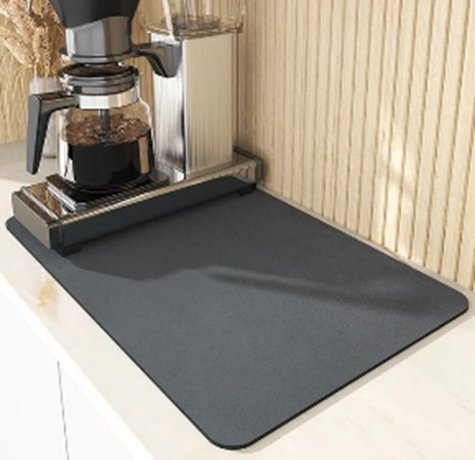 Sin marcas de agua: la superficie especial de poliuretano oculta bien las manchas de café, las manchas de leche y cualquier otra mancha oscura desordenada. Di adiós a la alfombrilla de café tradicional llena de manchas @@- Súper absorbente: la diatomita suave súper absorbente puede absorber salpicaduras de agua y verter café al instante sin ensuciar tu encimera @@- Fácil de limpiar y de secado rápido: no hay necesidad de limpiar con frecuencia porque oculta bien las manchas. Hasta un 90% de material de porosidad permite que la alfombrilla de barra de café se seque al aire rápidamente sin máquina @Parte trasera de goma: parte trasera de goma duradera que evita que el agua se filtre debajo y deje manchas en la encimera @@- Amplio uso : es más que una alfombrilla de café. Esta alfombrilla súper absorbente y de secado rápido se puede utilizar ampliamente como alfombrilla de secado de platos para platos y tazas en la cocina, bar y baño.