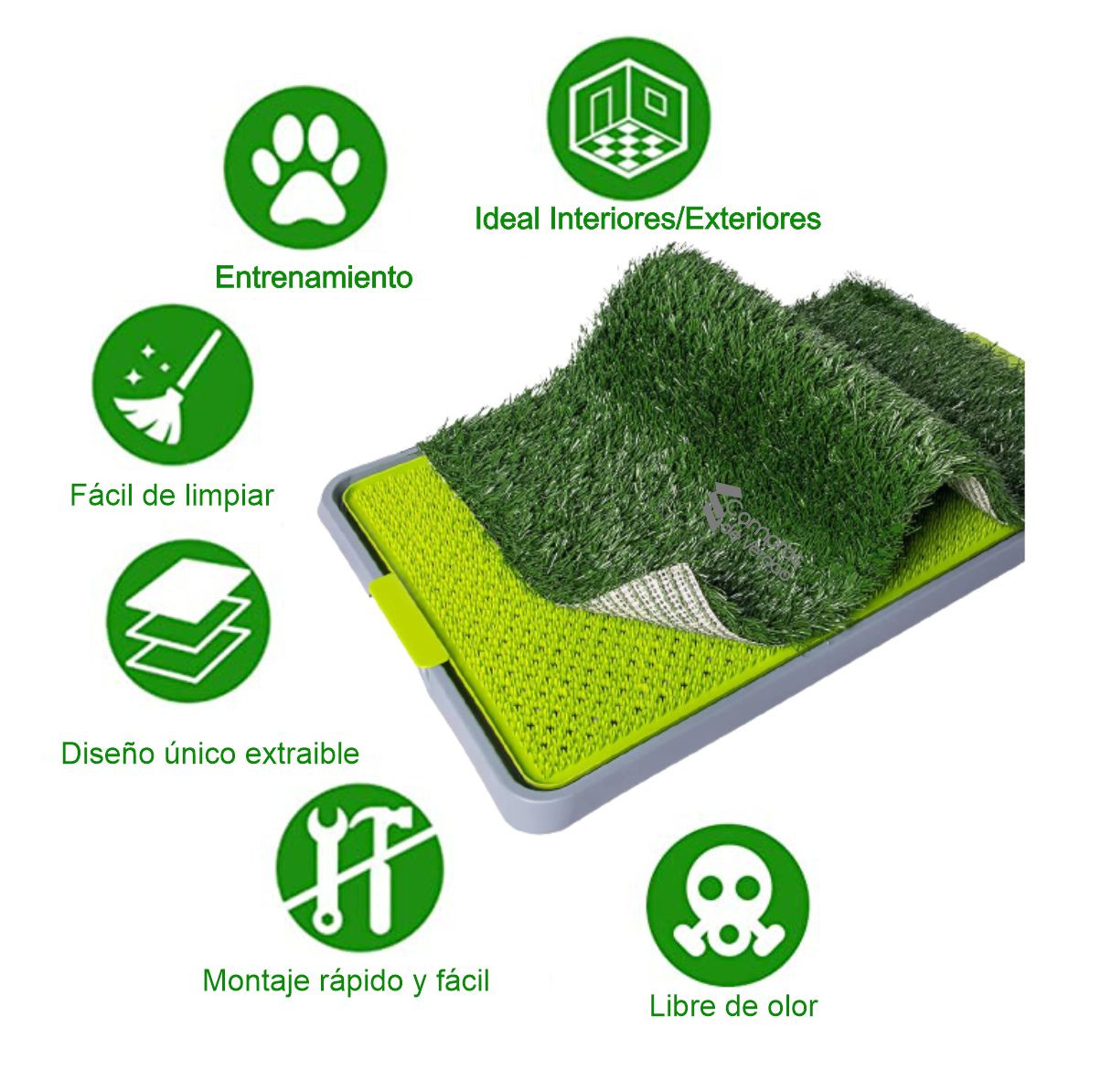 Se trata de una bandeja que se ve y se siente como césped y está impregnada con agentes antimicrobianos y un olor atrayente para que tu perro lo utilice.