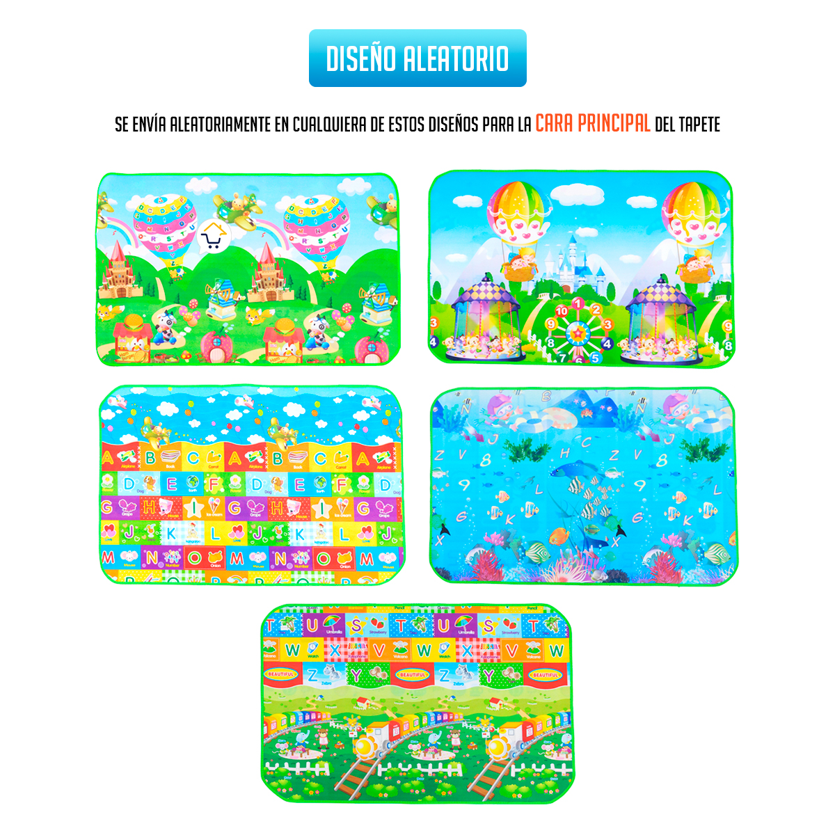 Tapete suave didáctico ideal para los bebés, con ilustraciones para enseñar a los niños a diferenciar colores y letras, como también animales y lugares, con sistema anti fluidos y diseñado en plástico suave el niño podrá jugar y descansar en él sin ningún problema.