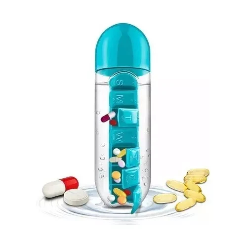 Botilito con organizador de vitaminas o pastillero semanal con 7 compartimientos asignados para cada día de la semana. Su diseño moderno permite remover el pastillero del botilito cuando se desee.