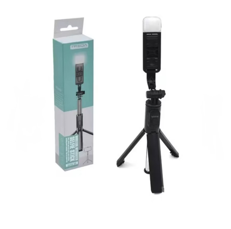 Selfie stick multifuncional, ideal para tomar excelentes fotos iluminadas gracias a su luz LED integrada, podrás usarlo como trípode y usar tu celular de forma vertical y horizontal para realizar excelentes tomas fotográficas, además cuenta con control remoto que funciona por medio de bluetooth.